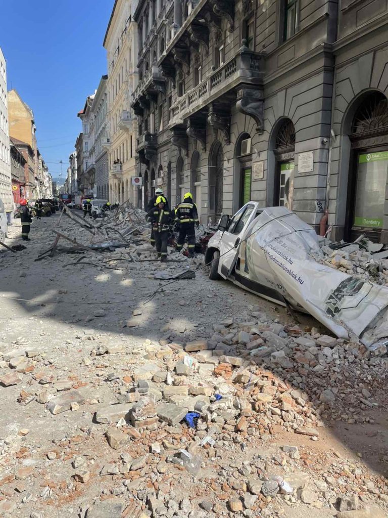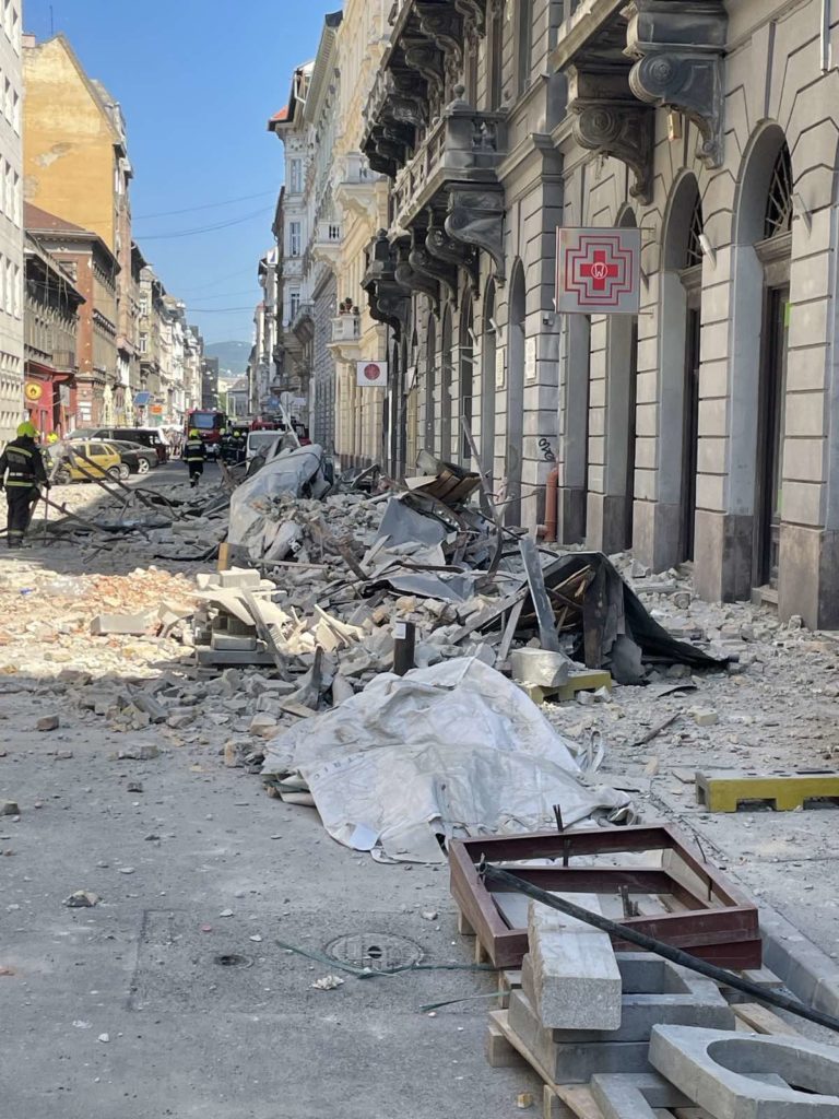 Am Montagmorgen sind Elemente der Fassaden- und Dachkonstruktion auf die Straße und auf geparkte Autos im VI. Bezirk in der Jókai Straße in Budapest gefallen. Der Einsturz ging vom Dach des fünfstöckigen Gebäudes aus, das auch die darunter liegenden Balkone mit sich riss. nach ersten Untersuchungen gibt es mehrere leicht Verletzte, die Polizei hat mit Hunden die beschädigten Autos durchsucht, glücklicherweise waren keine Menschen in den Fahrzeugen. Die Straße und einige Nebenstraßen wurden gesperrt, Feuerwehr und Rettungsdienst sind vor Ort und sichern die Region ab bzw. verschaffen sich einen weiteren Überblick auf der Unglücksstelle.
