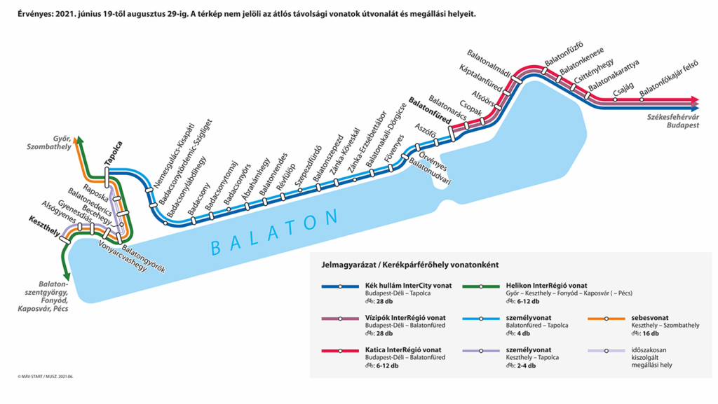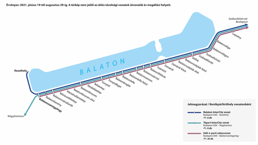 Auf dieser Grafik von MÁV sieht man welche Züge wie viel Fahrradkapazität haben. Die meisten Plätze für Fahrräder bietet der Zug zwischen Budapest Südbahnhof und Balatonszentgyörgy, welcher auch ganz entlang dem Südufer fährt.