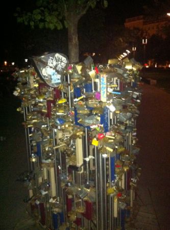 In der Nähe des Vörösmarty Platzes gibt es beispielsweise Baumgruppen die mit Schlössern behangen wurden. Warum gerade hier die Örtlichkeit so beliebt ist, konnten wir bisher nicht herausfinden. Die Paare die wir befragt haben wussten nur, dass es hier Tradition sei, sein „Liebesschloss“ aufzuhängen. In gemütlicher Parkatmosphäre ist man sogar teils ungestört um das Schloss zu platzieren.