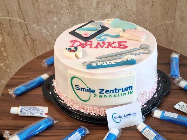 Nach der erfolgreichen Behandlung, hat der Patient dem gesamten Team der Zahnklinik „Danke“ sagen wollen und hat das mit einer speziellen Torte getan.