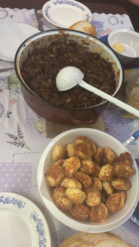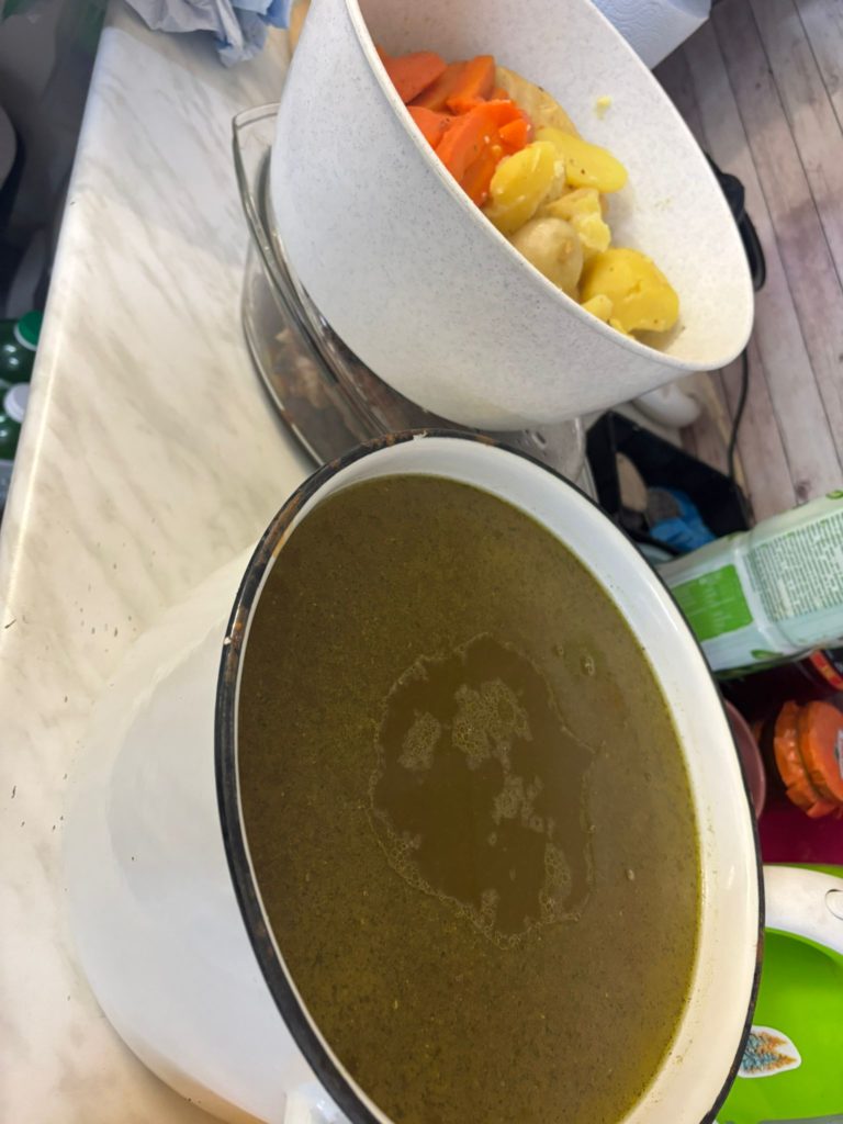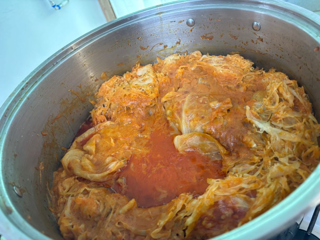 Das Mittagsmenü bestand aus frischer Knochenbrühe, gefülltem Kraut, gebratener Wurst und gebratener Leberwurst, serviert mit frischem Brot, Kartoffeln und eingelegtem Gemüse.