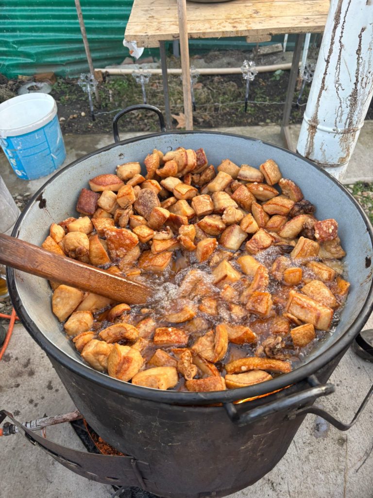 Das Schweinefett wird unter stetiger Aufmerksamkeit und Rühren verarbeitet, bis es zu einem knusprigen Snack wird, den wir Töpörtyű nennen.
