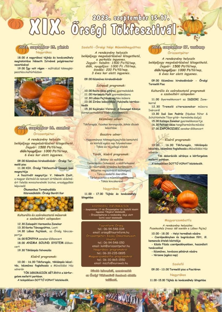 Das Herbstfestival der Region Őrség, das Kürbisfest, findet vom 15. bis 17. September statt. Die Besucher können herbstliche Aktivitäten in einer traditionellen und kulturell reichen Umgebung genießen. Die Veranstaltung hat sich zur größten gastronomischen Tourismusveranstaltung in der Region entwickelt. Auf die Besucher warten eine Handwerksmesse, Konzerte, köstliche Speisen und Kindervorführungen.