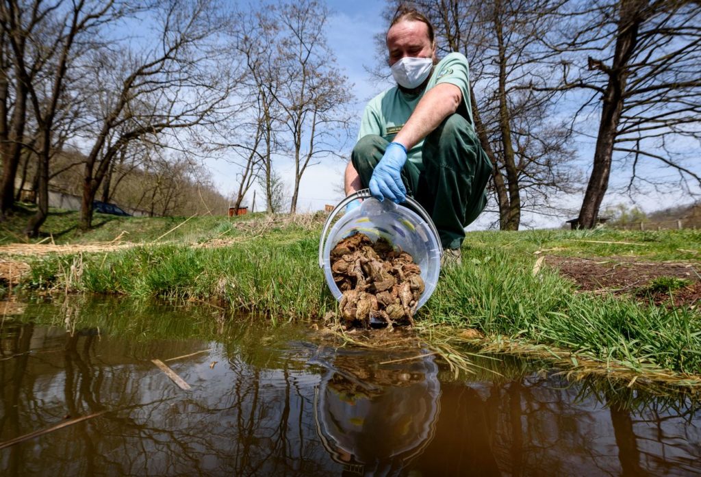 István Lantos, der Naturschutzbeauftragte der Direktion des Bükk-Nationalparks, hilft mit seinem Team den braunen Kröten über die Straße wie hier auf dem Bild zu sehen in der Nähe der Siedlung Zagyvaróna in Salgótarján. Jedes Frühjahr brechen die Kröten aus ihren unterirdischen Überwinterungsgebieten in großen Herden zu ihren Brutgebieten in Richtung eines nahe gelegenen Sees auf. Naturschützer helfen den Fröschen, die Straße zu überqueren. Schilder weisen derzeit in vielen Gebieten Ungarns auf die Krötenwanderung hin.