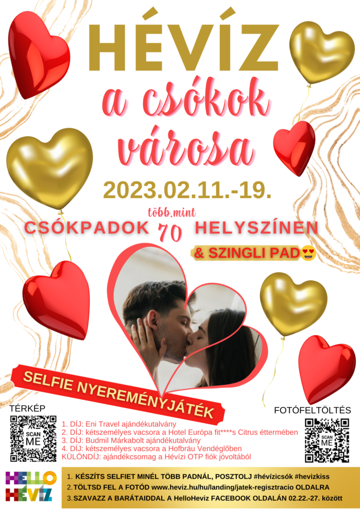 Auch in diesem Jahr ist in Héviz rund um den Valentinstag besonders viel „Love in the Air“… Denn wie in den Vorjahren stehen im ganzen Stadtgebiet an verschiedenen Punkten sogenannte Kussbänke. Und somit wird Héviz vom 11. Februar bis einschliesslich zum 19. Februar zur Stadt der Küsse. Was zu tun ist in dieser Zeit? Das Motto gibt es quasi vor. Denn die wunderschön geschmückten Bänke sollen zum Küssen einladen. Vielleicht auch nur die Zweisamkeit geniessen und den gemeinsamen Augenblick zelebrieren. Die Bänke sind natürlich alle derart schön geschmückt das sich auch ein gemeinsames Selfie lohnt. An erster Stelle kann das Selfie dann natürlich den besonderen Moment festhalten zum zweiten kann man diese Fotos auf einer Internetseite der Stadt Héviz mit vielen anderen Menschen teilen. Und das Teilen kann den speziellen Effekt mit sich bringen, daß man tatsächlich auch etwas gewinnen kann…Denn die schönsten Kussfotos werden prämiert und es steht ein Reisegutschein, ein Dinner zu Zweit oder auch ein Einkaufsgutschein auf der Preiseliste…Also der besondere Kuss in besonderem Ambiente lohnt sich…:)