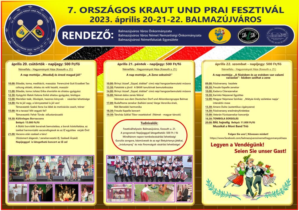 Zum siebten Mal findet vom 20. bis 22. April das Kraut und Prai Festival in Balmazújváros statt. Ziel der Veranstaltung ist es, die Erinnerungen an die Vergangenheit zu wecken und die Traditionen zu erhalten. Es handelt sich um eine Reihe von Veranstaltungen, die von der Stadt und dem Deutschen Nationalrat organisiert werden. Volkstanzgruppen, Bands und Musik werden das Publikum den ganzen Tag über unterhalten. In Kochwettbewerben werden die Talente der Kochteams unter Beweis gestellt. Es wird ein reichhaltiges Angebot an Speisen und Getränken geben und es gibt einen Ball bis zum Morgengrauen. Eine hochwertige Veranstaltung mit kulturellen Traditionen im schönen Balmazújváros.