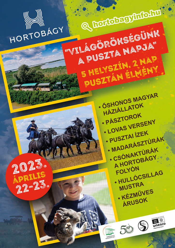 Am 22. und 23. April findet in der Hortobágy ein zweitägiges Veranstaltungsprogramm zum Welterbe – Puszta-Tag statt. Diejenigen, die an diesem Wochenende nach Hortobágy kommen, können die Hirten und ihr Vieh kennenlernen, die Naturschätze der Hortobágy entdecken, die lokale Küche erleben und die lokalen Geschmäcker kosten. Zu besichtigen sind unter anderem das Gestüt, die Schmalspurbahn, der Zoo und der Wildtierpark. Während der Veranstaltung können die Besucher an spektakulären Fütterungen teilnehmen, und stündlich findet eine geführte Motorboottour statt. Hier erhalten die Besucher einen Einblick in das alte ungarische Puszta-Leben.