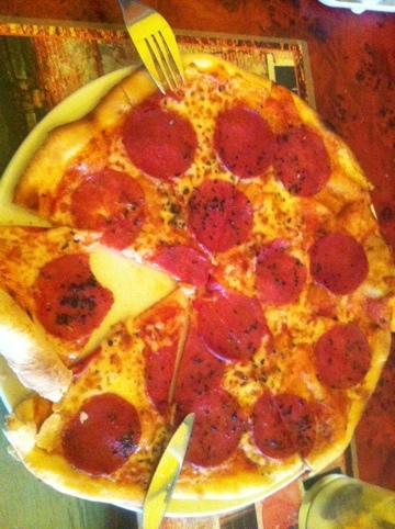 Die Pizzen sind gross, mit besonderen Gewürzen, hauchdünnem Boden im Steinofen gebacken.