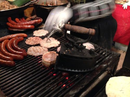 Auf den ungarischen Märkten wird er oftmals angeboten und vorher gut gebügelt… Ein guter ungarischer Burger. Auf dem Kohlengrill aufgewärmte Brötchen, Rinder- / Schweinefleischfrikadelle die mit einem schweren Bügeleisen auf den Grillrost gepresst wird. dazu kommt Salat, Tomaten, Zwiebel und sehr viel geriebener Käse. Einen Schuß Tomatensosse und etwas Senfsauce mit süsslichem Einschlag.