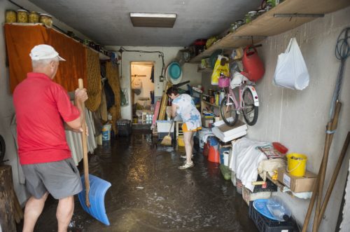 Lakók söprik, lapátolják ki a vizet egy elöntött garázsból a nyíregyházi Kert közben 2018. augusztus 9-én. Fákat döntött ki egy erõs széllel, felhõszakadással és jégesõvel kísért vihar Nyíregyházán és környékén. Több helyen az alagsorokba és pincékbe is befolyt az esõvíz.