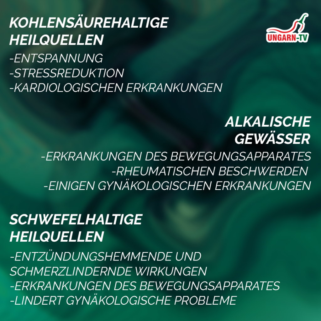 Die heilenden Thermalquellen sind in allen Regionen des Landes zu finden und versorgen zahlreiche Heilbäder. Budapest ist die einzige Hauptstadt der Welt mit Thermalbädern. Die ungarische Badekultur, die auf den Schätzen der Heilwässer basiert, reicht über 2000 Jahre zurück. Die wertvollen Heilquellen des Landes sind weltweit bekannt und spielen eine bedeutende Rolle im Tourismus. Aus diesem Grund ist Ungarn ein beliebtes Ziel im internationalen Gesundheitstourismus.