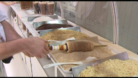 Dann rollen wir den Teig aus und schneiden diesen in cirka 2 cm breite Streifen und wickeln diese um die vorher mit geschmolzener Butter bepinselten Holzwalzen. Vor dem Backen bröseln wir den Teig im Kristallzucker ein. Danach backen wir den Teig auf der Walze über dem Holzkohlengut gedreht, etwa 10-15 Minuten, bis der Zucker am Teig karamellisiert wird. Wenn es fertig ist, rollen wir den Kuchen in nach eigenem Geschmack abgeschmeckten Zucker oder Nüsse, Kokosraspel.