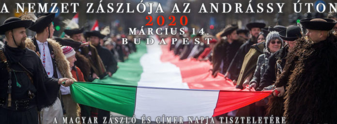 1848 önkéntes viszi végig a két méter széles nemzeti lobogót március 14.-én a budapesti Andrássy úton.