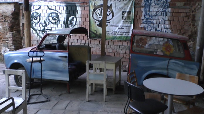 Eine absolut abgefahrene Location: Die Roncs-Bar in Debrecen. Direkt gegenüber des großen Einkaufszentrum Forum befindet sich die Roncs-Bar. Gerade im Sommer ist die Bar besonders interessant denn in dem großen Aussenbereich befinden sich zahlreiche Trabis die als Sitzgelegenheit ausgebaut sind. Überall an jeder Ecke befinden sich lustige Utensilien und das macht die Schrott-Bar wohl auch aus.
