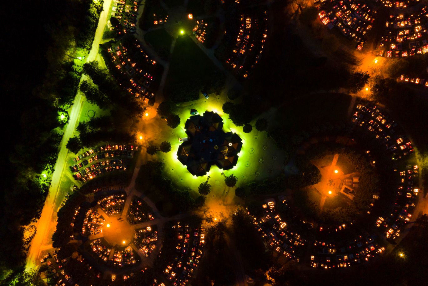 Hier sehen wir eine Luftaufnahme vom friedhof in Zalaegerszeg, der schon durch seine kreisrunde Form etwas Besonderes ist. Mit den stimmungsvollen Lichtern sieht es jedoch nochmal viel stimmungsvoller aus!