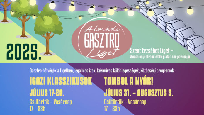In diesem Sommer erwacht der Szent Erzsébet Liget in Balatonalmádi wieder zum Leben! Vom 17. bis 20. Juli findet das Almádi Gasztro Liget statt – ein kulinarisches Wochenende unter schattigen Bäumen, wo feine Genüsse auf geselliges Beisammensein treffen.