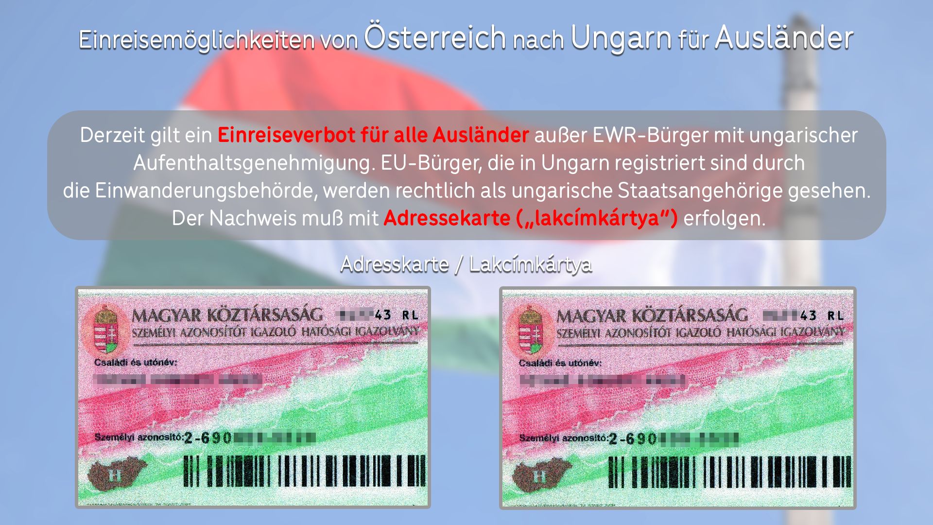 Es gilt derzeit in Ungarn immer noch ein Einreiseverbot für Ausländer außer EWR Bürger mit ungarischer Aufenthaltsgenehmigung. EU Bürger die in Ungarn registriert sind durch die Einwanderungsbehörde, werden rechtlich als ungarische Staatsbürger angesehen. Der Nachweis muss mit Adresskarte erfolgen. Um nach Ungarn einzureisen, sollte man als EU-Bürger über Österreich per PKW ankommen. Es sind dan folgende eingezeichnete Grenzübergange für EU-Bürger mit vorher genannten erforderlichen Genehmigungen bzw. Registrierungen geöffnet. Wichtig, nur über diese Grenzübergänge kommt man als Ausländer ins Land. Ungarn und Österreicher im Grenzgebiet können einige weitere Grenzübergänge nutzen.