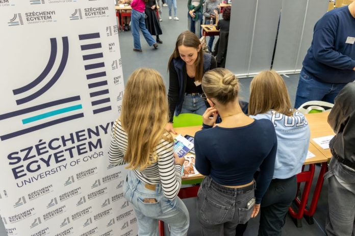 Am 18. Oktober fand an der Győrer Bildungseinrichtung zum fünften Mal eine Bildungsmesse statt. Aufgrund des stetig wachsenden Besucherzustroms wird die ursprünglich im zweijährigen Rhythmus geplante Informationsveranstaltung seit neuestem jährlich angeboten. Neu in diesem Jahr war auch der Veranstaltungsort: Die Stände der Aussteller waren in der großen Sporthalle aufgebaut, wo sich interessierte Schüler – dieses Jahr waren insgesamt nahezu 450 gekommen – auch Vorträge anhören konnten.