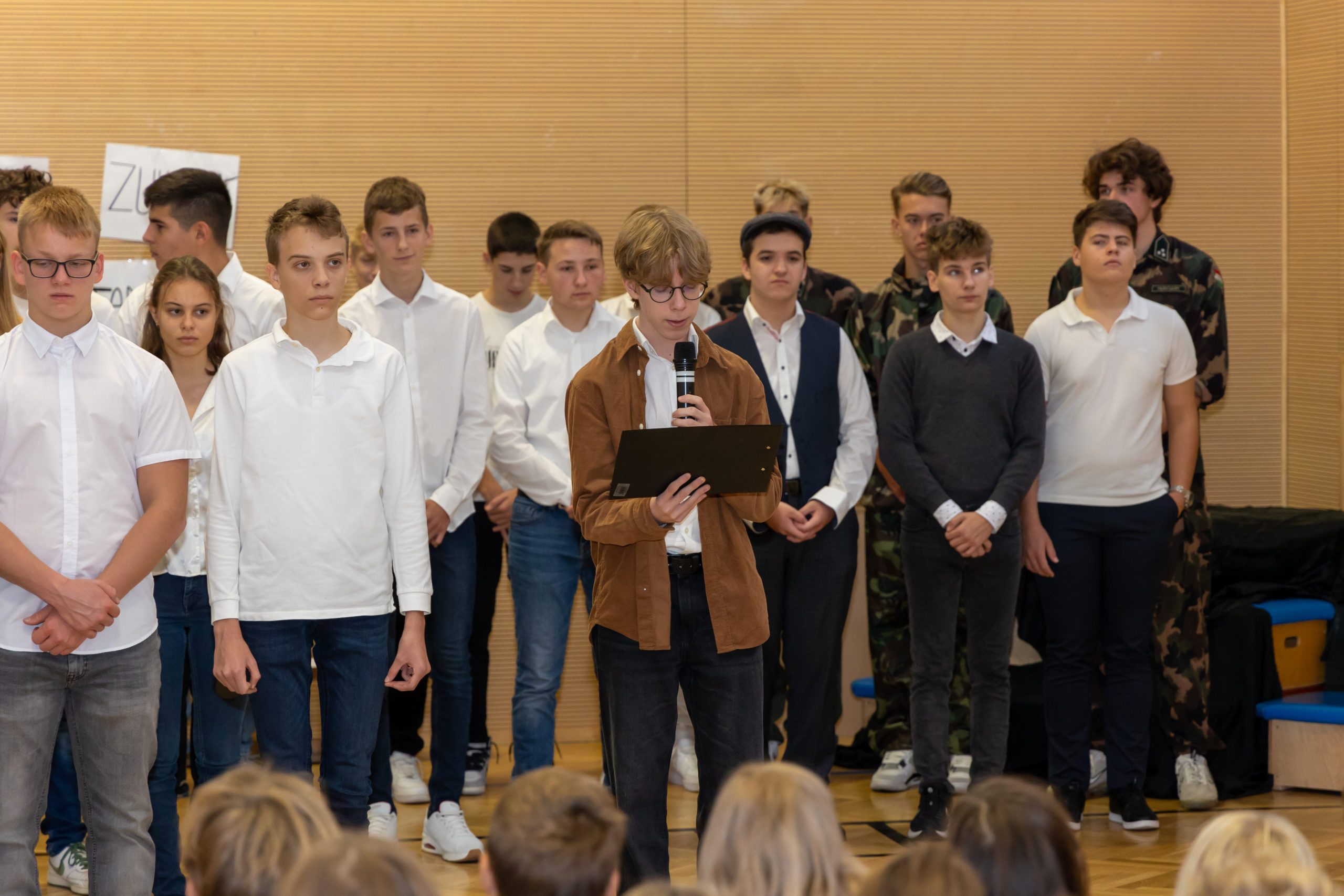 Dem Aufstand vom 23. Oktober 1956 ging das dunkelste Kapitel der Nachkriegszeit Ungarns voraus. Der wachsende Widerstand gegen die stalinistische Diktatur führte zunächst zu friedlichen Demonstrationen der Budapester Studenten, die dann in eine bewaffnete Auseinandersetzung mündete. Nach anfänglichen Erfolgen folgte am 4. November die blutige Niederschlagung des Freiheitskampfes. Diese wohl prägendsten Tage der ungarischen Geschichte des 20. Jahrhunderts bildeten die Basis der Gedenkfeier. Schülerinnen und Schüler des 9. Jahrgangs der Audi Hungaria Deutsche Schule Győr stellten die Vorgeschichte und die tragischen Ereignisse des Freiheitskampfes der Ungarn szenisch dar. In kurzen Sequenzen mit passender musikalischer Untermalung vermittelten sie die Stimmung der Bevölkerung vor, während und nach dem Aufstand: Zuerst friedlich spielende Kinder, Menschen gemütlich im Café sitzend, Freunde im Gespräch, Freundinnen beim Spaziergang, Plakate an der Wand mit Werten, wie Freiheit, Sicherheit, Zukunft, Heimat … dann plötzlich ein entsetzter Schrei, die Idylle ist dahin, heilloses Durcheinander, Menschen werden verhaftet, Soldaten reißen die Plakate ab, es werden die Symbole der Staatsgewalt hochgehalten. Diese werden am Ende von den Revolutionären wieder entfernt, die Gefangenen werden freigelassen, das berühmte Symbol des Aufstands, die ungarische Fahne mit dem herausgeschnittenen Sowjetstern wird geschwenkt. Die Feierstunde endete mit einem Ausschnitt aus einem zeitgenössischen Werk (Autor: Péter Gosztonyi), in dem die Ereignisse zusammengefasst und die Bedeutung des Aufstandes dargelegt sind. Darin heißt es unter anderem, dass die Geschichte der Revolution nicht nur aus Unruhe und Kampf bestand, sondern auch das größte Glück der vorangegangen 100 Jahre war. Die zehn Tage von Beginn des Volksaufstandes bis zu seiner Niederschlagung waren das Himmelreich selbst. Das ganze Land war glücklich. In Anlehnung an diese Gedanken ist es den Mitwirkenden der Gedenkfeier gelungen, den zweifelsohne tragischen und traurigen Ereignissen von 1956 etwas Versöhnliches abzugewinnen und dies ihren Mitschülerinnen und Mitschülern zu vermitteln.
