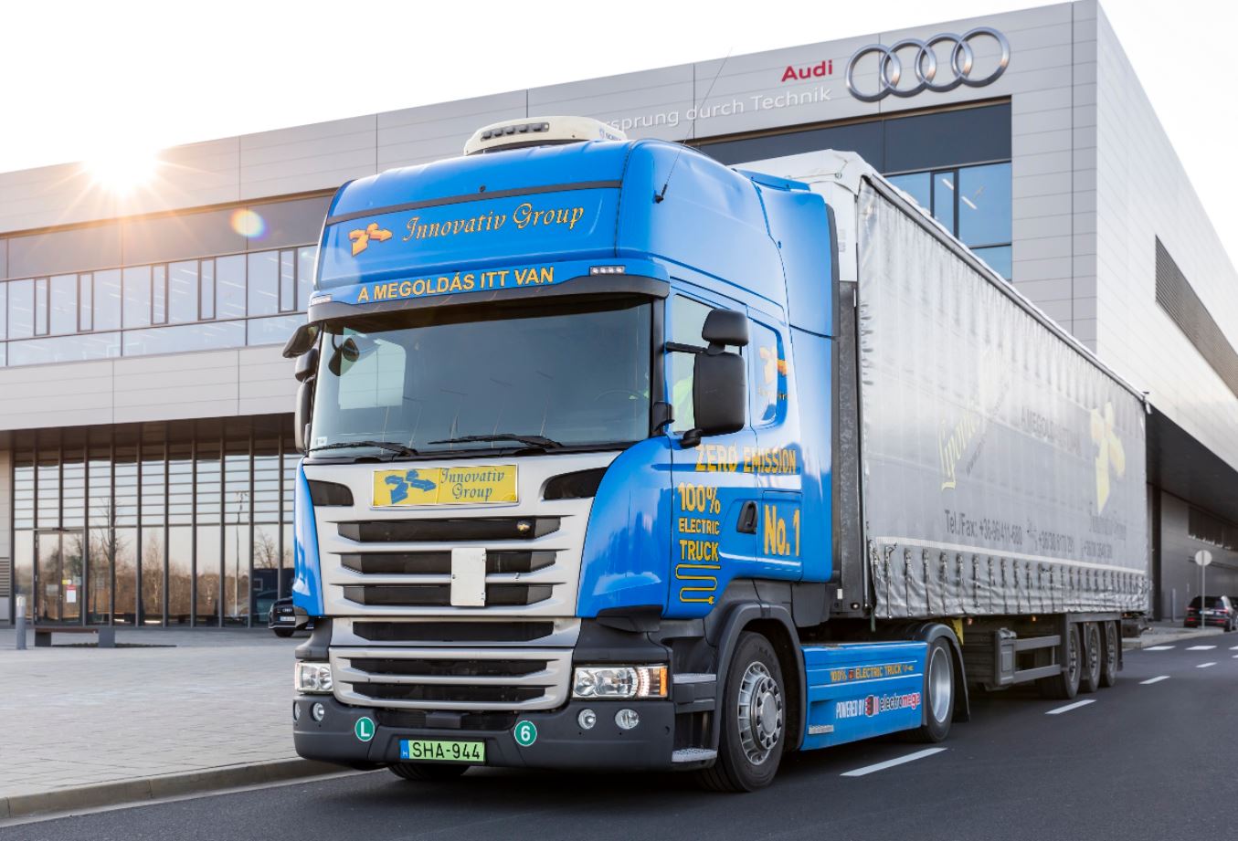Vom Logistikoptimierungszentrum des Unternehmens startet alle 90 Minuten ein LKW voller Bauteile in Richtung Fahrzeugmontage und kehrt mit dem Leergut wieder zurück. Ein Mitglied der pendelnden LKW-Flotte ist eine ungarische Entwicklung: ein vollelektrischer LKW auf Scania-Basis. Der E-LKW wurde vom Logistikpartner der Audi Hungaria, der Imperial Logistics Kft. und ihrem Partner, der Innovatív Raktárlogisztika Kft. in Testbetrieb genommen. Zwischen zwei Ladungen legt der E-LKW 7-11 Runden zurück, was einer Strecke von 60-100 Kilometern entspricht. Durch den Einsatz des Elektro-LKWs kann jährlich bis zu 40 Tonnen CO2-Ausstoß vermieden werden. Audi Hungaria prüft die Möglichkeit, weitere elektrische Transportmittel in der Logistik zu verwenden.