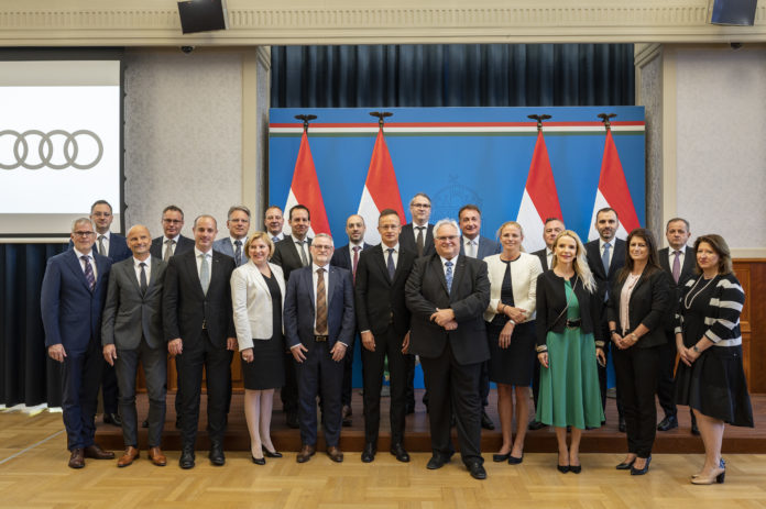 Das Portfolio an elektrischen Antrieben der Audi Hungaria wird künftig weiter ausgebaut: dies kündigten Péter Szijjártó, Ungarns Minister für Außenwirtschaft und Auswärtiges, Balázs Róbert Simon, Parlamentsabgeordneter, Alfons Dintner, Vorsitzender des Vorstands der Audi Hungaria und Robert Buttenhauser, Vorstand Produktion Antriebe der Audi Hungaria am heutigen Tag im Außenministerium gemeinsam an. Die Investition, an der auch Ungarns Regierung beteiligt ist, wird dazu beitragen, mehr als 260 Arbeitsplätze zu sichern und Ungarns Position in der globalen Automobilindustrie weiter zu stärken.