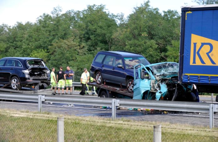 Bei einer Kollision auf der Seite der Autobahn M5 nach Szeged bei Inárcs wurde eine Person getötet! Mehrere Fahrzeuge fuhren am Mittag aufeinander. Ein Anhänger mit Autos, sowie zwei LKWs waren an dem Unfall beteiligt. Der Fahrer des Autotransporters wurde in seinem Fahrzeug eingeklemmt und konnte nur noch tot aus dem Fahrzeug geborgen werden. Die Autobahn ist aufgrund des schweren Unfalles voll gesperrt.