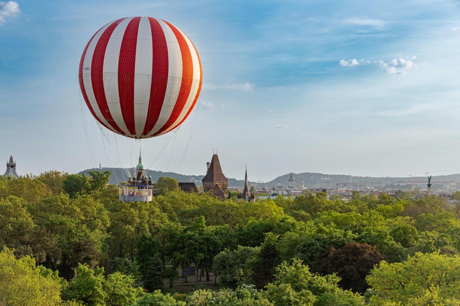 Der Aussichtspunkt Ballon in Városliget ist ein mit Heliumgas gefülltes Luftschiff, das am Boden befestigt ist und praktisch als Aufzug im Freien fungiert, sodass es seinen Lande- und Startpunkt, den Mimóza-Hügel, nicht verlässt. Der Ballon erreicht seine maximale Höhe von 150 Metern in etwa 5 Minuten, verbringt die gleiche Zeit in der Luft und kehrt ebenfalls in 5 Minuten an die Oberfläche zurück. Von dieser Höhe aus können Besucher bei klarem Wetter ganz Budapest und seine Umgebung aus der Vogelperspektive betrachten. Es kann bis zu 30 Passagiere zusätzlich zum Piloten befördern – bei einer Altersgrenze von 6 Jahren und älter können Jung und Alt das Erlebnis des Fliegens ausprobieren.