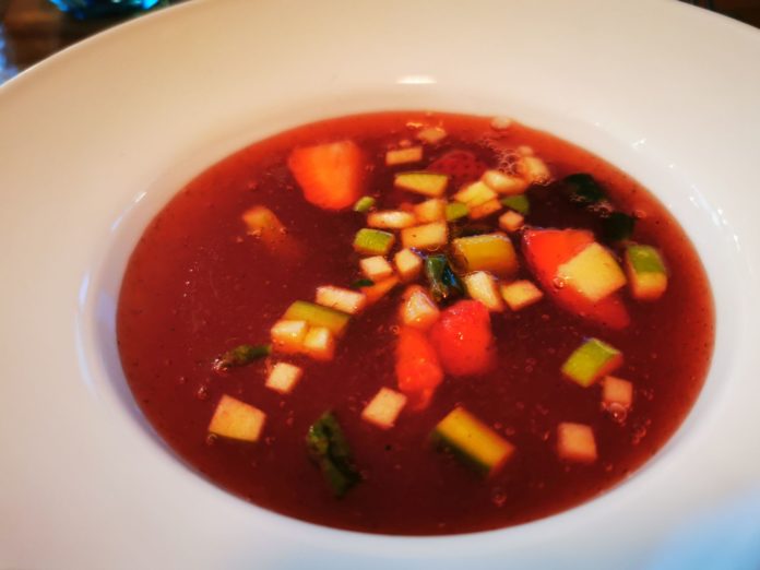 Ungarn hat viele kulinarische Finessen zu bieten. Gerade im Sommer mögen wir es frisch und oft fruchtig. Das Bistro Sparhelt in Balatonfüred hat daher die Suppenkarte aktualisiert und setzt auf fruchtig-gemüsigen Genuss. Denn die frische Erdbeersuppe ist anegerichert mit frischen Spargelstücken. Die Erdbeerstückchen, Apfelstücke treffen sich in der kalten Suppe hier mit dem grünen Spargel.
