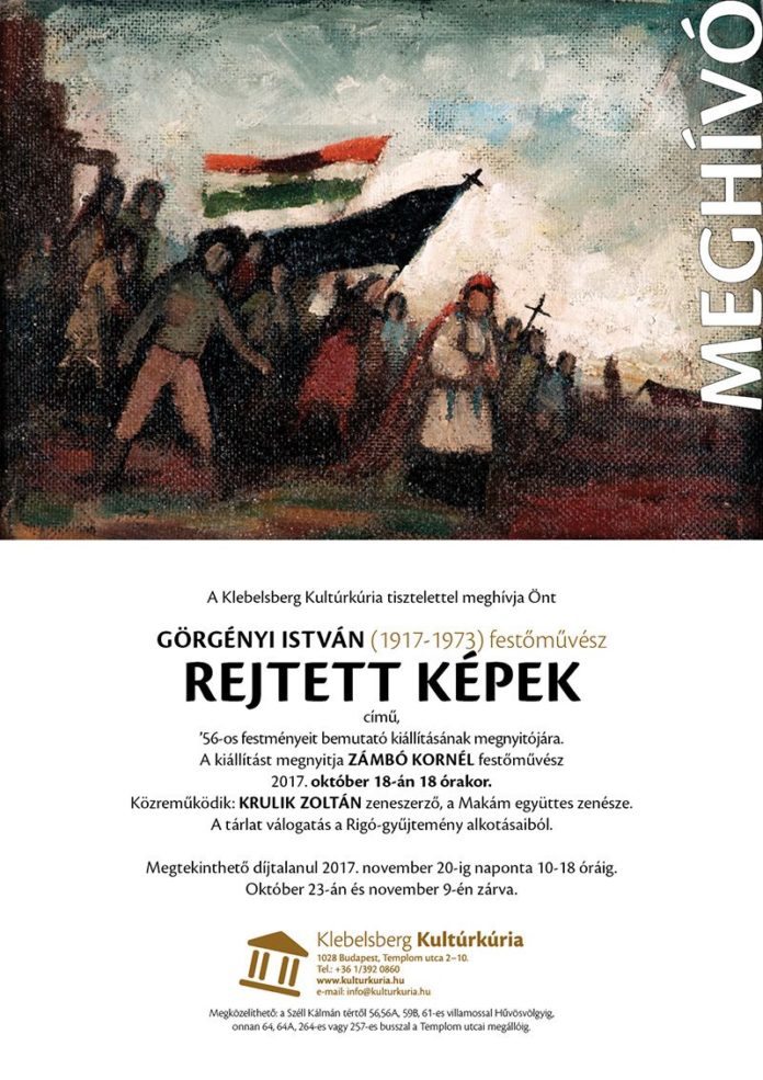 Unter dem Titel „Versteckte Bilder“ (Rejtett képek) wird ab 18. Oktober eine interessante Gemäldesammlung von István Görgényi in der Klebelsberg Kultúrkúria in Budapest in der Templom u. 2-10 zu sehen sein. Der Maler aus Tatabánya hielt seine persönlichen Eindrücke von der gescheiterten Revolution 1956 im Nachgang in mehreren Bildern fest. Eine Auswahl hiervon wird jetzt gezeigt.