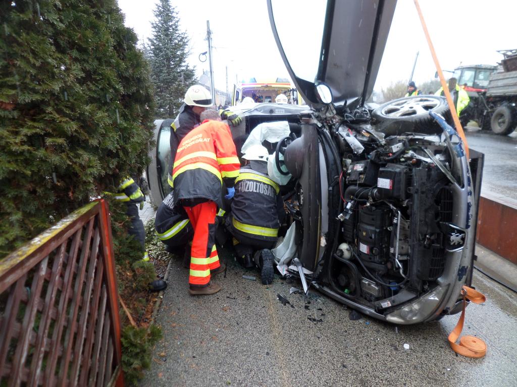 Ein Auto und ein Traktor kollidierten in der Rákóczi-Straße in Körmend, vor einer Pension. Nach dem Unfall prallte das Auto auf den Bürgersteig und blieb auf der Seite stehen. Der Fahrer und Beifahrer steckten im Autowrack fest, sie mussten von den Feuerwehrleuten mit schwerem Gerät befreit und schließlich dem Rettungsdienst übergeben werden. Die Einheiten sicherten die Fahrzeuge und beseitigten das Verkehrshindernis.