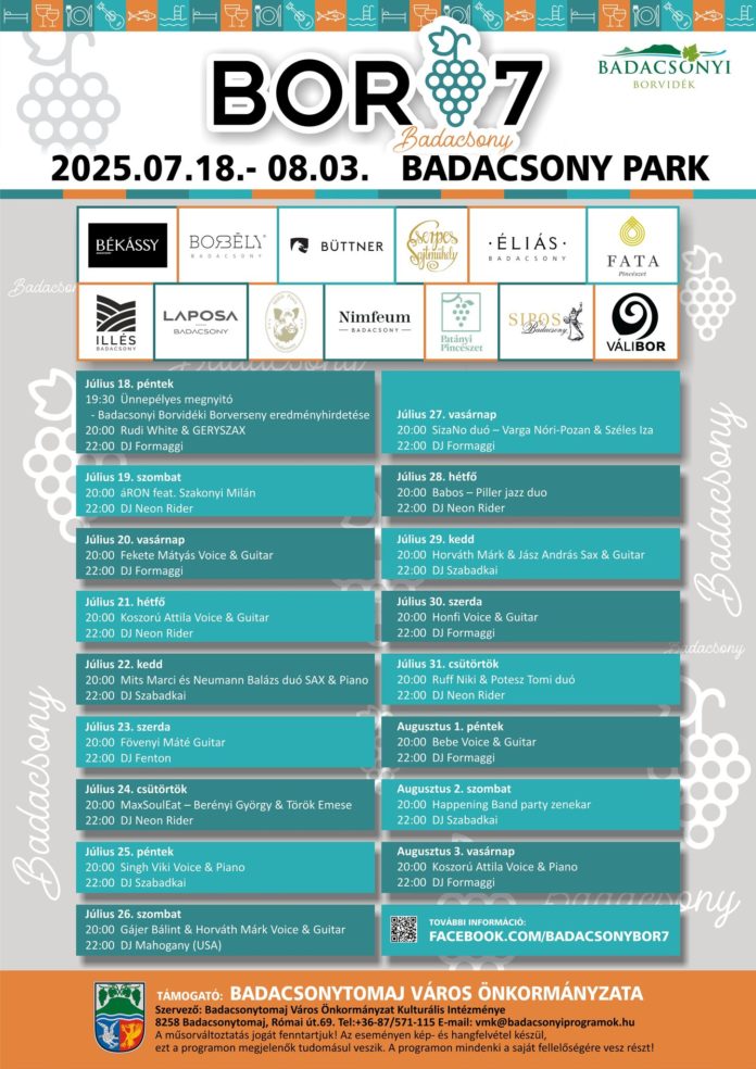 Vom 18. Juli bis 3. August 2025 finden die Badacsony Weinwochen, das sogenannte „Bor7“ Gastrofestival, statt.