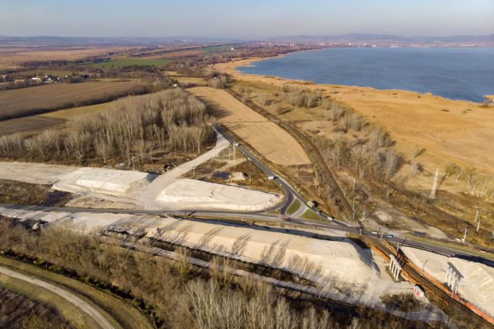 Auf dem Foto sieht man den Weg der im Bau befindlichen Autobahn M76 an der Mündung des Flusses Zala in der Nähe von Keszthely am 20. Dezember 2019. Die neue Schnellstraße verbindet die Autobahn M7 mit Zalaegerszeg, wo sie auch an den Flughafen Sármellék vorbeiführt.