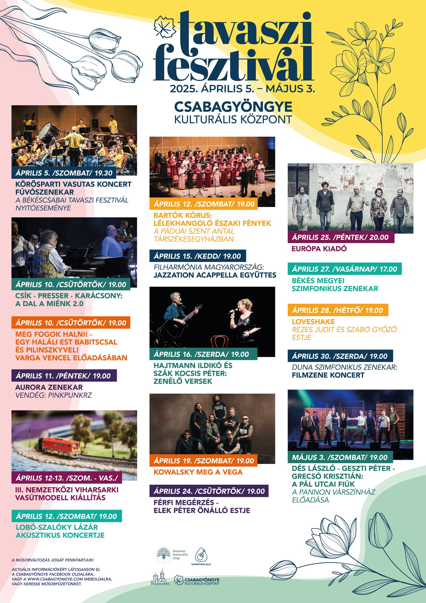 Zu den Höhepunkten zählen das Konzert von Csík-Presser-Karácsony (10. April), der Auftritt von Kowalsky meg a Vega (19. April) und das Musical Die Jungs von der Paulstraße (3. Mai). Zudem gibt es ein internationales Modelleisenbahn-Treffen, ein Filmkonzert sowie eine landesweite Kreuzworträtsel-Meisterschaft.