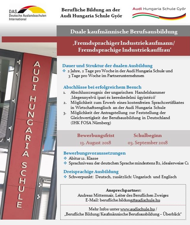 Die duale Berufsausbildung ‚Fremdsprachige Industriekauffrau/Fremdsprachiger Industriekaufmann‘ findet überwiegend in deutscher Sprache statt und wird an zwei Lernorten durchgeführt. Die theoretischen Grundlagen werden die Auszubildenden an zwei Schultagen pro Woche in der Audi Hungaria Schule Győr erwerben, während die praktische Ausbildung an drei Tagen in der Woche bei einem Partnerunternehmen – AUDI HUNGARIA, DUVENBECK, KNÜPPEL, MOL, REHAU – stattfindet. Diese im Jahre 2016 OKJ-akkreditierte Ausbildung richtet sich an besonders motivierte und leistungsfähige Abiturienten mit guten Deutschkenntnissen.