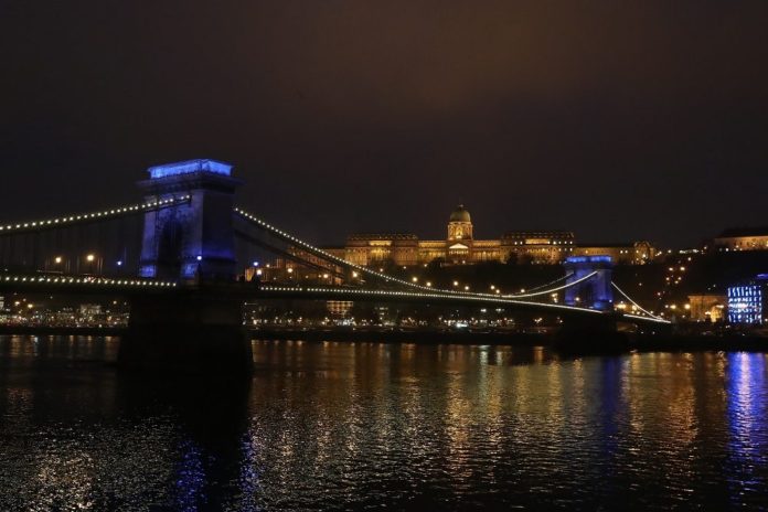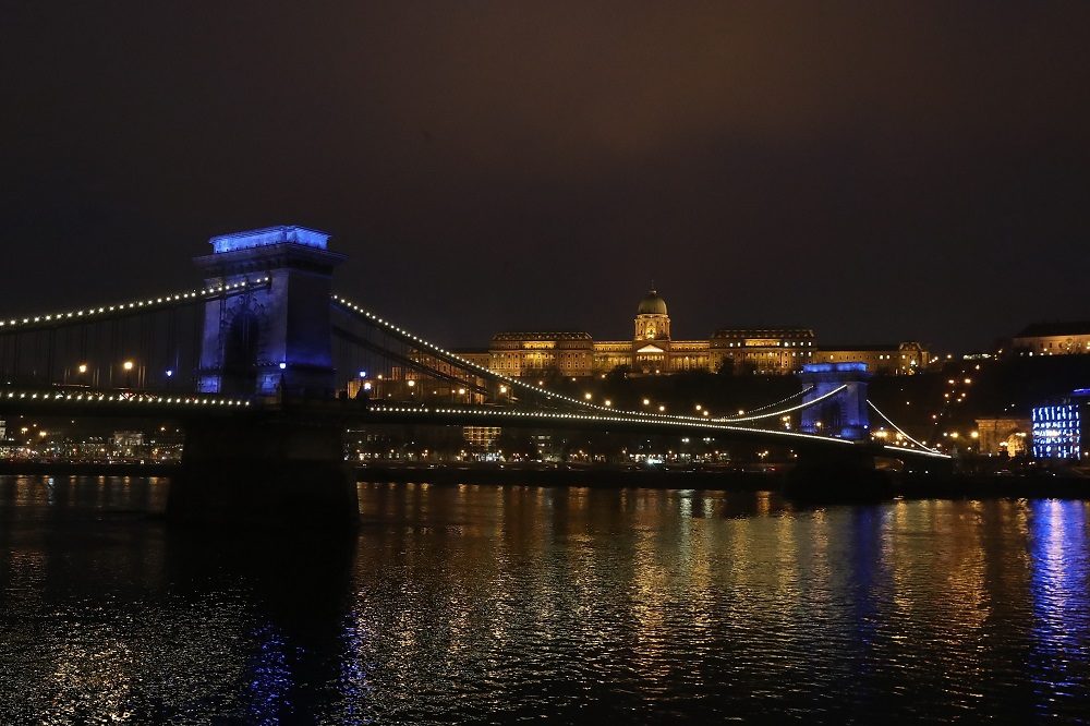 Am Welttag des Kinderrechte am 20. November waren viele ikonische Gebäude entlang der Donau blau bedeckt worden, darunter auch die Kettenbrücke, das Hotel Clark und die MÜPA.