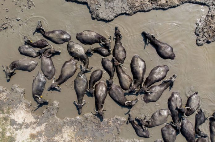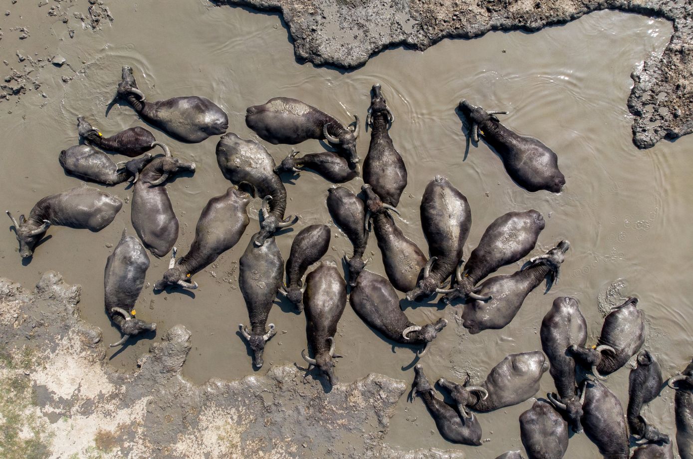 Hier kühlt sich gerade eine Büffelherde in der Puszta in einem Schlammloch ab. In Hortobagy leben große Wasser-Büffelherden und sie gehören zum Bild der Puszta. Vielleicht hat man sich heute morgen zu einem Wellnessbad verabredet…Die Schlamm-Masken sollen in ungarn ja auch ganz hervorragende gesund sein…
