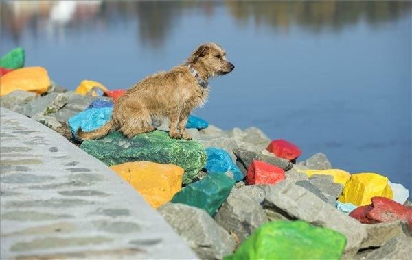 Maybe that’s the first question what people say about this dog, which seems to be on the Danube bank in Szentendre. In her new installation, the artist Kyru(Krisztina) made a colorful-stone art in the tourist-popular baroque city north of Budapest. She wants to made people smile and show the other perspective of photography. That’s her job, and it brings joy to the dogs to 🙂
