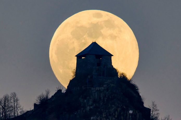 Spektakuläre Mondbilder gestern Abend und in der Nacht in Ungarn am Himmel zu sehen: Der aufgehende Mond ist hinter der von Somoskőújfalu fotografierten Burg Salgo zu sehen.