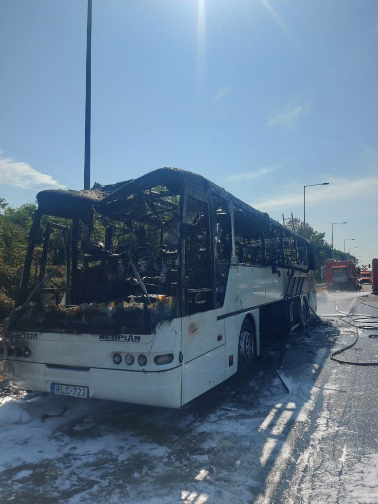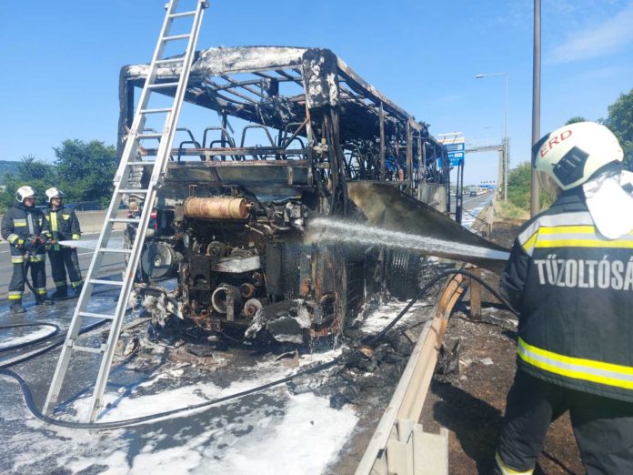 Ein Bus stand gestern nachmittag in Flammen auf dem gemeinsamen Abschnitt der Autobahnen M1-M7 in der Nähe von Budaörs ! Als die Feuerwehr am Unfallort eintraf, stand der Bus bereits vollständig in Flammen. Der Brand wurde von der Berufsfeuerwehr aus Törökbálint und der Hauptstadt mit Hilfe mehrerer Löschangriffe abgelöscht, die erhitzten Metallteile wurden abgekühlt und anschließend wurde das ausgebrannte Fahrzeug geborgen. Der betroffene Autobahnabschnitt war während der Löscharbeiten komplett gesperrt. Der Fahrer war die einzige Person im Bus. Er konnte das Fahrzeug rechtzeitig verlassen.