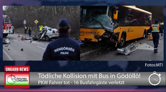 Bei einer schweren Kollision zwischen einem Linienbus und einem PKW in Gödöllo wurde der PKW-Fahrer tödlich verletzt. Bei der Kollison wurden auch 16 Fahrgäste des Busses verletzt und mussten ins Krankenhaus gebracht werden. Mit dem Stichwort „Massenanfall von Verletzten“ wurde sogenannter MANV-Alarm ausgelöst. Das Auto wurde völlig zerstört und durch die Wucht des Aufpralles konnte der Autofahrer die Kollision nicht überleben. Die Polizei ermittelt nun die Unfallursache.