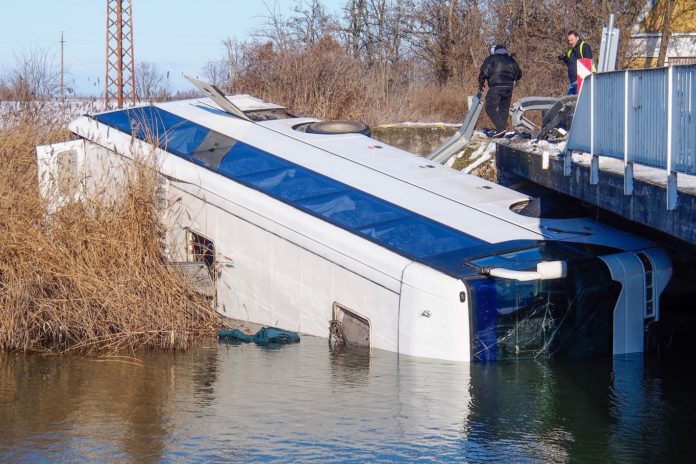 In der Region Bezirk Bács-Kiskun ist in Tass heute ein Bus verunglückt. Das Gafährt kam von der Strasse ab und stürzte in den Kiskunsági Kanal. Zum Glück befanden sich zum Zeitpunkt des Unglücks nur vier Personen an Bord des Busses. Alle vier Insassen und Fahrer wurden mit dem Rettungswagen verletzt in ein Krankenhaus gebracht.