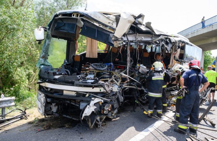Die technische Bergung des Unglücksbusses, der heute frühmorgens auf der M7 gegen einen Brückenpfeiler geprallt ist, wurde mittlerweile abgeschlossen. Acht Menschen wurden bei dem Unfall getötet, 48 Menschen wurden verletzt. Der Bus kam von einer Kurztour aus Kroatien. An Bord ungarische Touristen.