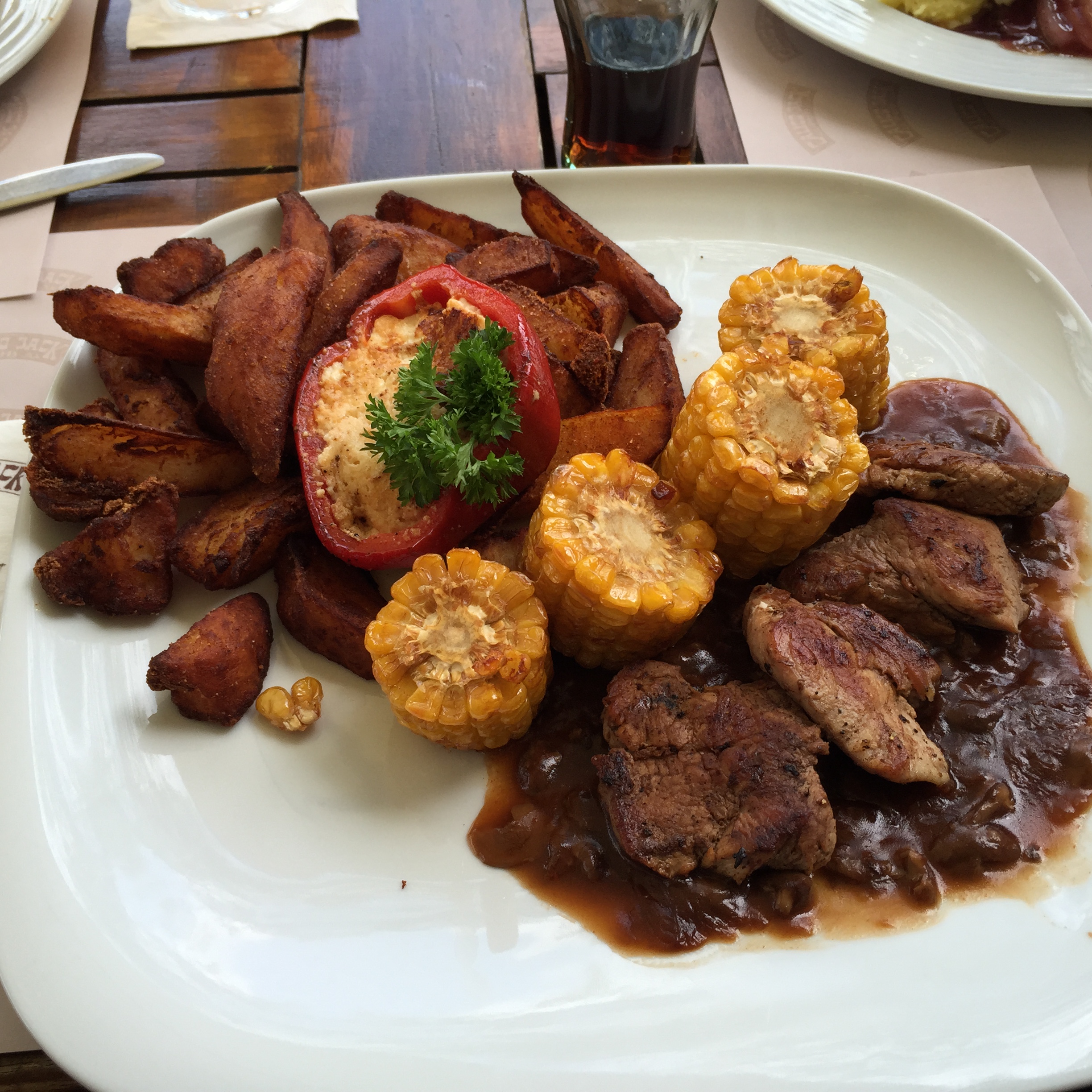 Schweinelendchen zartrosa angebraten mit leckerer Zwiebelsoße, Maiskolben sowie Kartoffelecken. Gut, viel und lecker! Wer Fleich liebt, wird Calico Jack lieben.