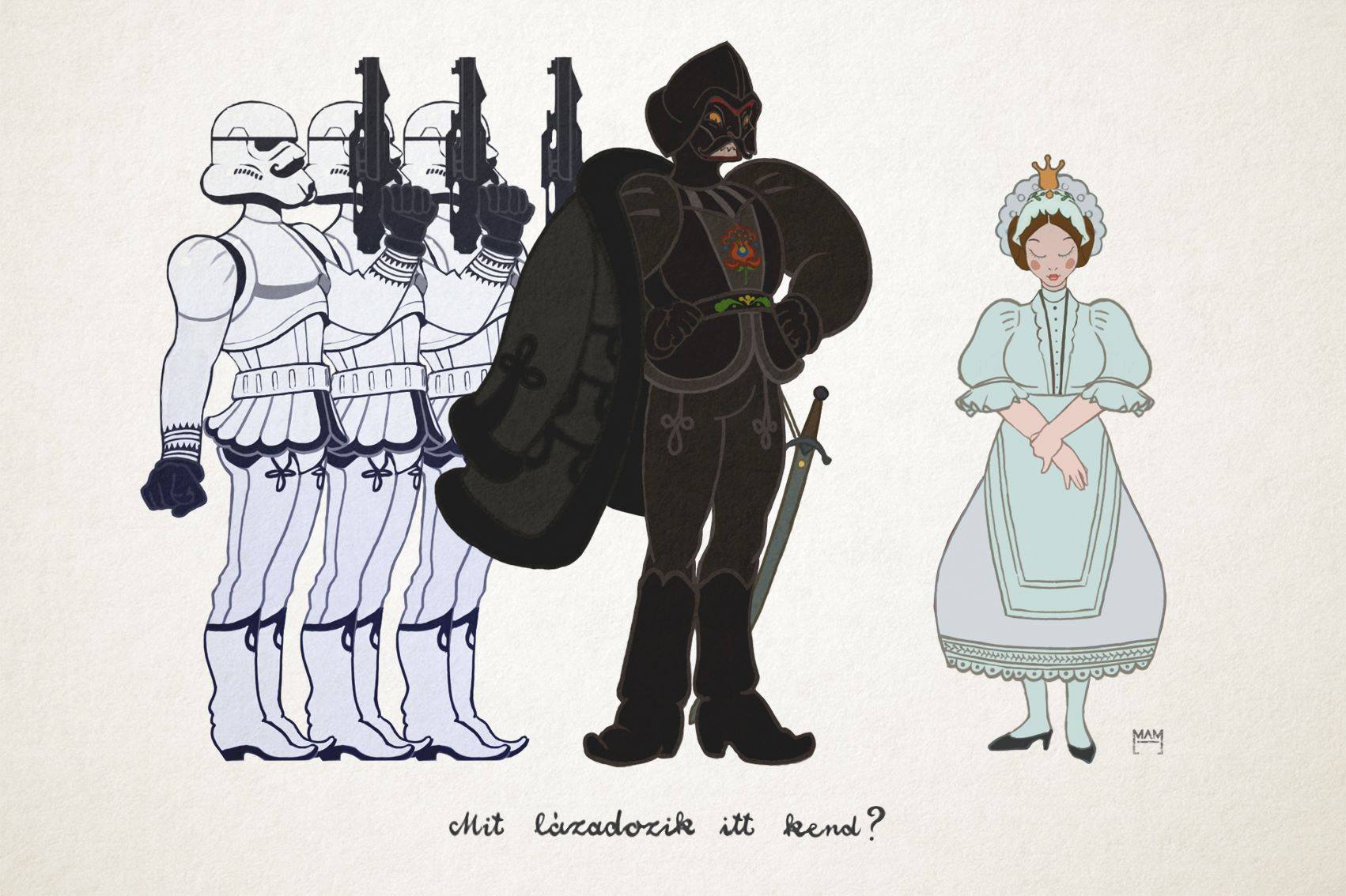 Marton Ádáms Grafiker Zeichnungen erschienen jetzt auf der Seite von ContextUs und erzählen die Geschichte von Star Wars: New Hope im ungarischen Volksmärchen-Stil. Viele Menschen teilen es und Tausende von ihnen mögen es auf Facebook.