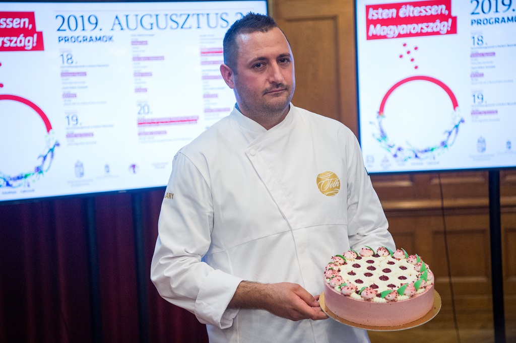 László Gyuris, Konditormeister der Cappella-Konditorei in Szeged, wird seine Kreation, den kleinen Kastanienkuchen, der als zuckerfreier Kuchen Ungarns ausgewählt wurde, auf der Pressekonferenz der Organisatoren der Feierlichkeiten am 20. August im Jagdsaal des Parlaments vorstellen.