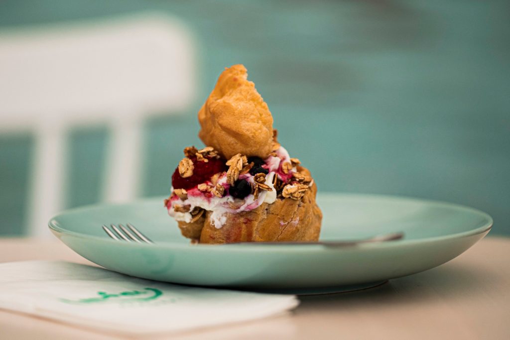 Der Name Granola Optimist bezieht sich auf das Optimist-Segelboot, mit dem Kinder das Segeln lernen. Der Bootskörper und das Segel bestehen aus Brandteigkrapfen, gefüllt mit einer Honig-Joghurt-Creme, garniert mit Waldfruchtsoße und Granola.