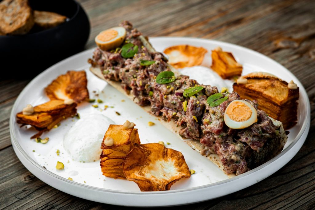 Laut Gábor Kardos wird das Büffel-Tatar aus Büffelfleisch aus Zalaköveskút zubereitet und mit Kartoffelgratin, Meerrettichschaum, Selleriechips, Sardellen, Kapern, Gewürzgurken und hausgemachter Mayonnaise serviert.