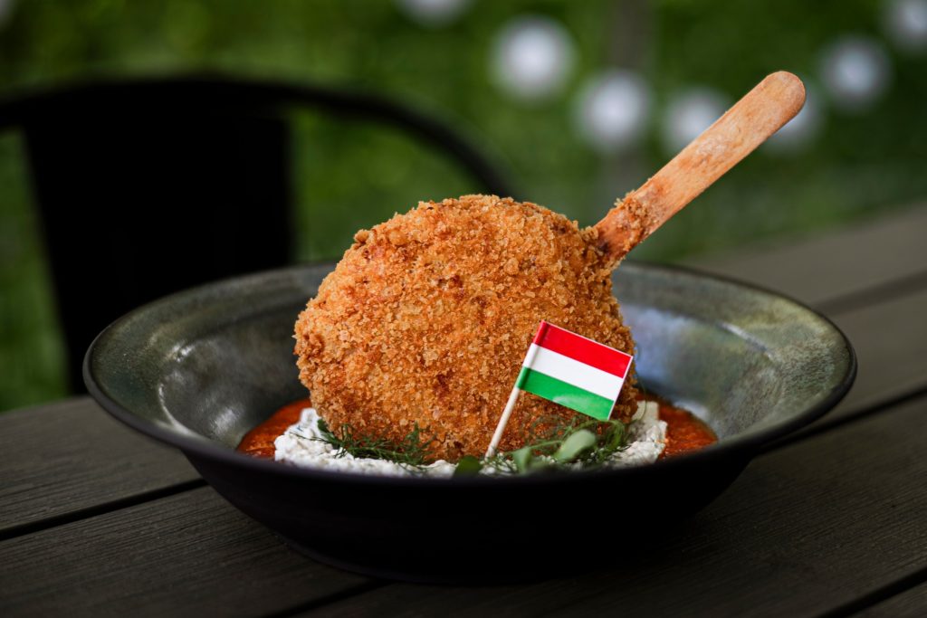 Die Idee für das Pizza-Sztori-Gericht stammt von den römischen Reisbällchen (Suppli). Hierbei wird Wels-Paprikasch mit Quarknudeln kombiniert, zu einer Lutscherform geformt, paniert und frittiert. Serviert wird das Ganze mit Dillquark und Paprikacreme.