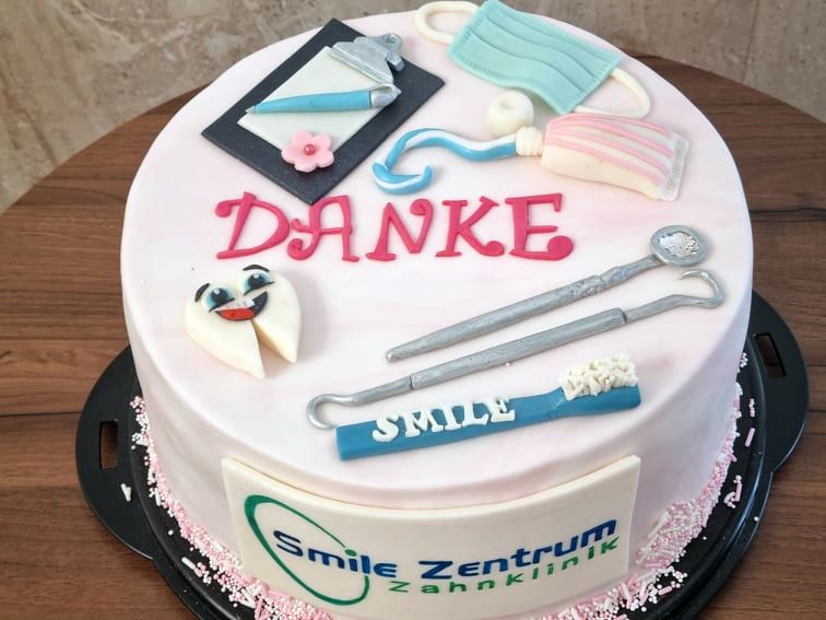 Nach der erfolgreichen Behandlung, hat der Patient dem gesamten Team der Zahnklinik „Danke“ sagen wollen und hat das mit einer speziellen Torte getan.