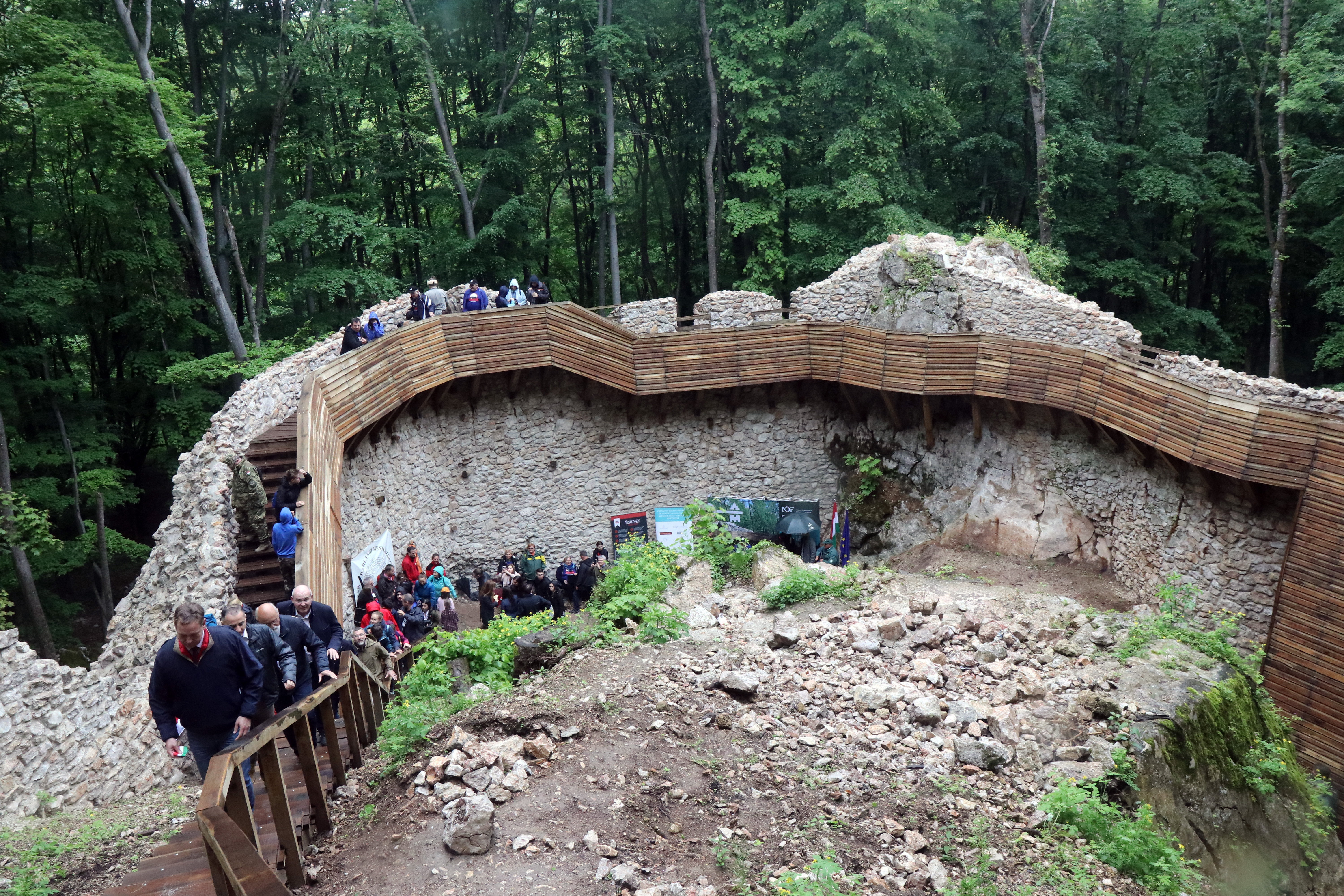Der neue Besucherweg hält einen sicheren Abstand zu gefährlichen Wänden, Kellern und Zisternen. Die Bänke, Informationstafeln, Fahnenmasten, Steinlager und Gehwege, die in der bewaldeten Ruinengegend errichtet wurden sind alle aus traditionellem Material, Eichenholz gemacht.